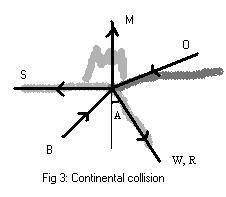 If there is another continent on the subducting plate, the two continents collides rising a folded mountain chain after the oceanic crust on the subducting plate was consumed. The continental crust of the subducting plate gets folded at the surface of the subduction zone. The weight of these newly created folded mountains (M) acts upward at the SP as shown in the Fig. 3. M acts as a break to the subduction process and as it builds up slows the subduction. Decrease in the subduction rate and the continuous melting of the slab may reduce the length of the slab considerably. W decreases with the decreasing length of the slab. Subduction process, mountain buildup and the melting of the slab continues until all the forces acting at the SP reaches the state of equilibrium. At this point the absorption of the slab stops and ceases the mountain buildup. In turn the two continental plates glued together by the mountain chain and moves united towards the existing subduction zones. At this time only two forces will be acting at the SP, buoyancy lifts upward and the weight of the crust including mountains acts downward in an equilibrium state. Depending upon the relative motion of the surrounding plates and the final motion of the new plate, any of the adjoining ridges closes completely and creates a new ridge on the ocean floor. Ridges on the ocean floor continuously rearranges in different directions while the continents were heading towards the Supercontinental formation. When all the continents were collided to form the Supercontinent, folded mountain chains and the magma within the ridges glued the plates together as a single plate causing the Tectonic pause.